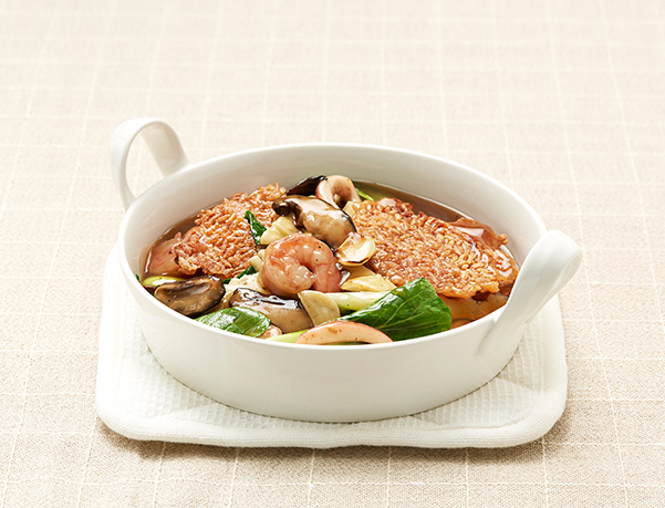 6. 볶아낸 해물과 채소를 큰 접시에 담는다. 튀긴 누룽지를 올리고 (4)의 소스가 뜨거울 때 붓는다.